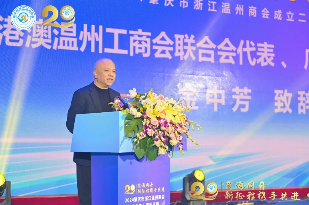 粤港澳温州工商会联合会代表 、 广州温州商会会长金中方代表致辞,向肇庆市浙江温州商会成立二十周年表示热烈祝贺。他充分肯定肇庆市浙江温州商会在壮大温商事业、促进肇庆与温州两地经济发展中的重要贡献。作为粤港澳温商联合会的成员,肇庆市浙江温州商会与大湾区内其他温州商会关系深厚。希望商会未来抢抓机遇,勇于创新,为粤港澳温州人团结发展和大湾区高质量发展贡献更多力量。